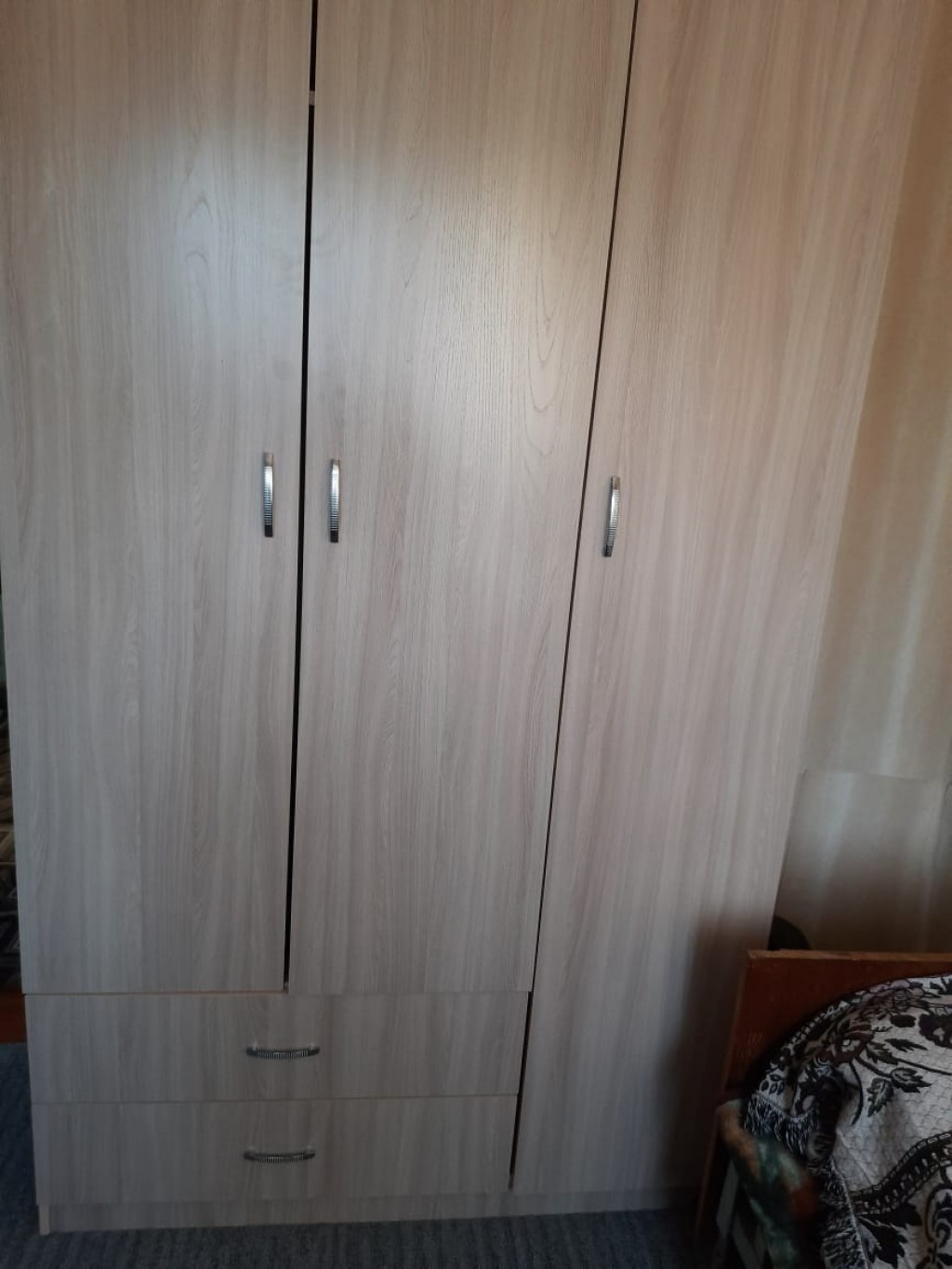 Трехстворчатый шкаф с выдвижными ящиками. Шкаф состоит из трех секций: одна оснащена полкой и штангой, вторая пятью нишами, третья двумя выдвижными ящиками. Такой шкаф идеально подойдет для размещения как одежды и белья, так и постельных принадлежностей.